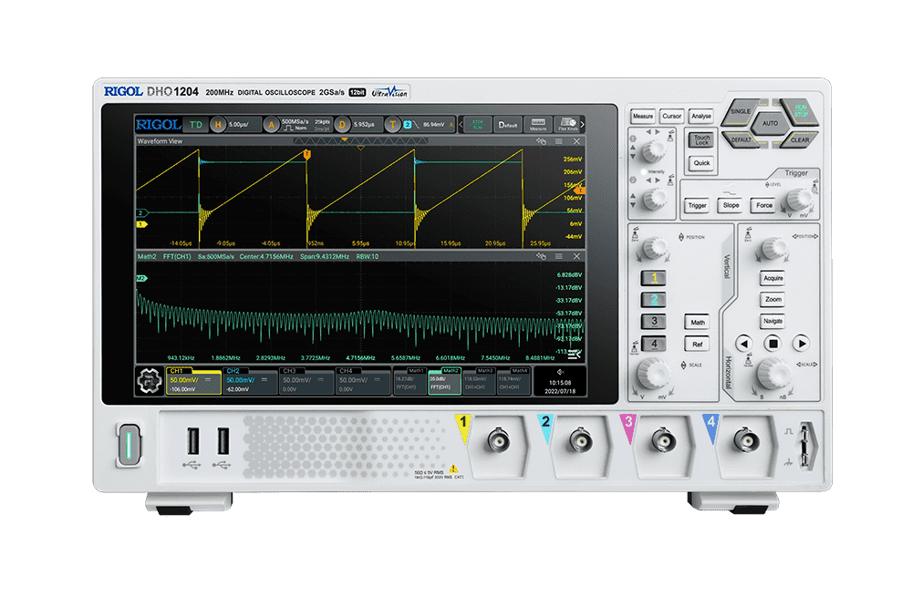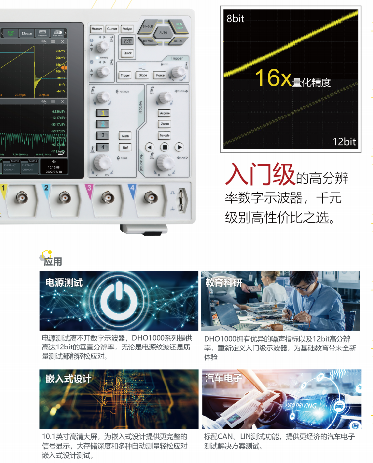 DHO1000 系列數(shù)字示波器是針對最廣泛的主流數(shù)字示波器市場的設(shè)計、調(diào)試、測試的需求而設(shè)計的數(shù)字示波器。搭載 RIGOL 全新自研半人馬座技術(shù)平臺,實現(xiàn)了 1,500,000 次/秒波形捕獲率(Ultra Acquire Mode)、100 Mpts 存儲深度、12 bit 分辨率、優(yōu)秀的本底噪聲性能和垂直測量精度,能滿足更高精度的測量需求,為用戶帶來超凡的測試測量體驗。