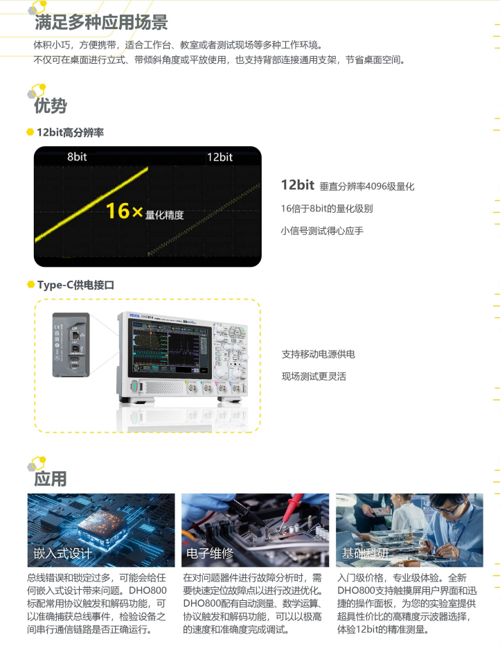 DHO800 系列示波器是普源精電全新推出的高性能經(jīng)濟型數(shù)字示波器。雖然體積小巧,卻具有 1,000,000wfms/s 波形捕獲率(Ultra Acquire Mode),25 Mpts 存儲深度,12 bit 高分辨率和低噪聲等性能優(yōu)勢。DHO800 系列數(shù)字示波器是針對最廣泛的主流數(shù)字示波器市場的設計、調(diào)試、測試的需求而設計的全新經(jīng)濟型數(shù)字示波器。